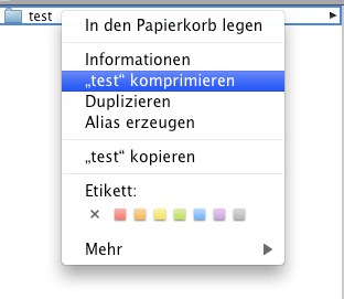 Im Finder rechten Mausklick (bzw. Control-Klick) auf die Datei oder den Ordner und dann aus der Liste “komprimieren” (bei Leopard) oder “Archiv erstellen” (bei Tiger) wählen. Fertig.